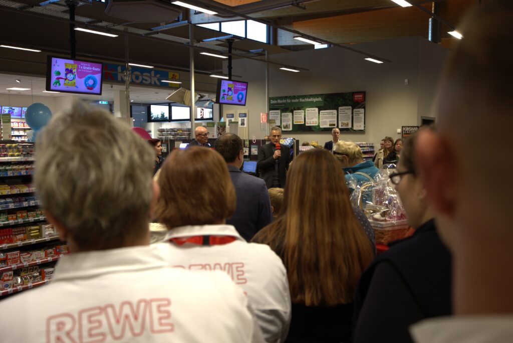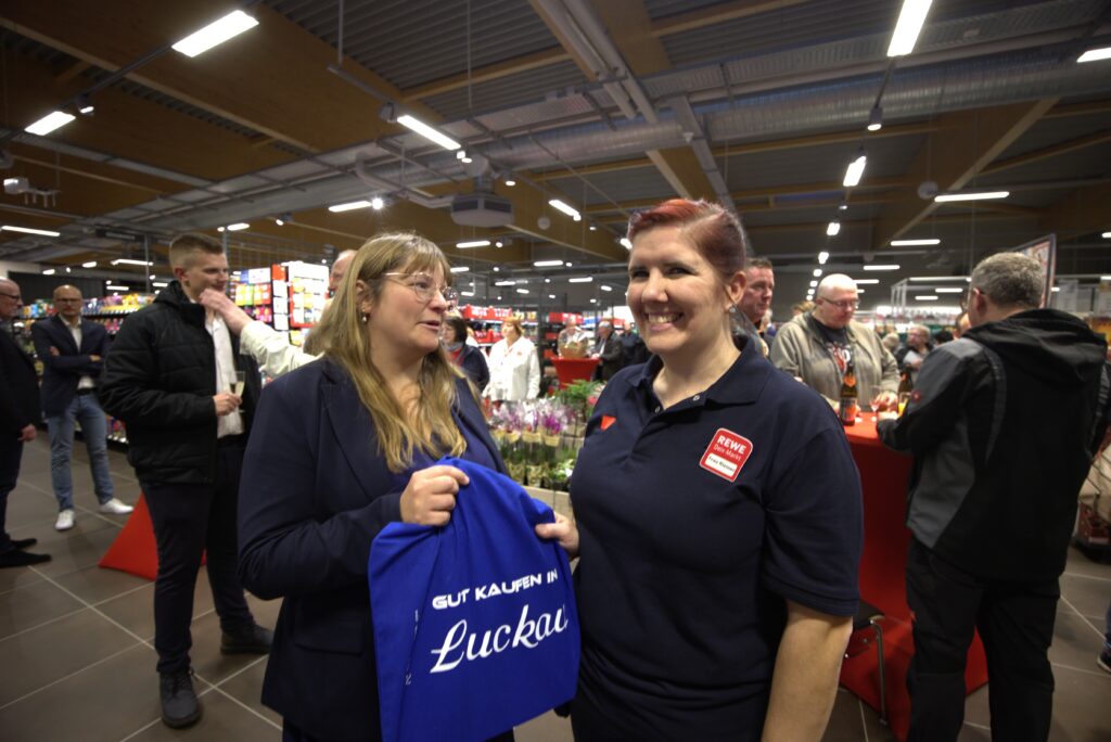 Mit einem Festakt wurde am 6. November‘25 der REWE-Markt in Luckau eingeweiht. Für den bürgeroffenen Gewerbeverein „ Wir sind Luckau“ e.V. gratulierte der Chefin Christine Riemer mit den besten Wünschen unsere designierte Vereinsvorsitzende Jasmin Steffin. (Im kommenden Frühjahr ist Neuwahl im Verein.) Begleitet wurde sie von unserem Vereinsmitglied Fred Bauer. Neben einem Grussschreiben erhielt Frau Riemer einen historisch bebilderten Jahreskalender für 2026.